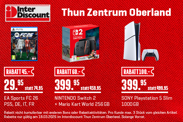 Die Angebote gelten nur am Mittwoch, 18. März 2026 in der Interdiscount-Filiale im Zentrum Oberland. Rabatt nicht kumulierbar mit anderen Bons oder Rabattaktivitäten. Pro Kunde max. 3 Stück vom gleichen Artikel. Rabatte nur gültig am 18.03.2026 im Interdiscount Thun Zentrum Oberland. Solange Vorrat.