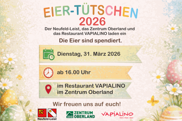 Der Neufeld-Leist, das Zentrum Oberland und das Restaurant VAPIALINO laden ein zum Eier-Tütschen 2026. Die Eier sind spendiert!